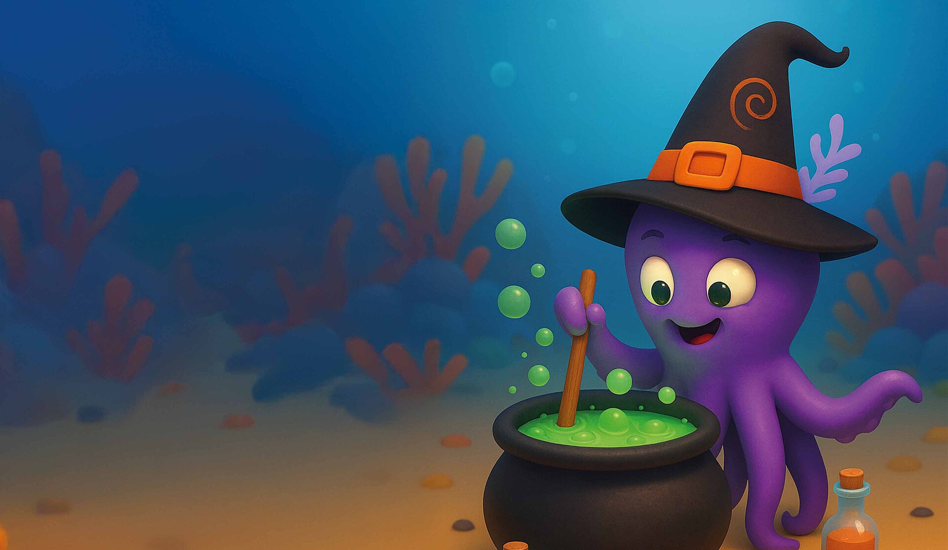 Octoween, la pieuvre sorcière des océans, prépare une potion magique pour Halloween afin d'inverser le sort.